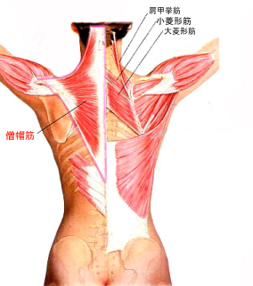 真ん中左側の三角形の形をした筋肉が「僧帽筋」です。