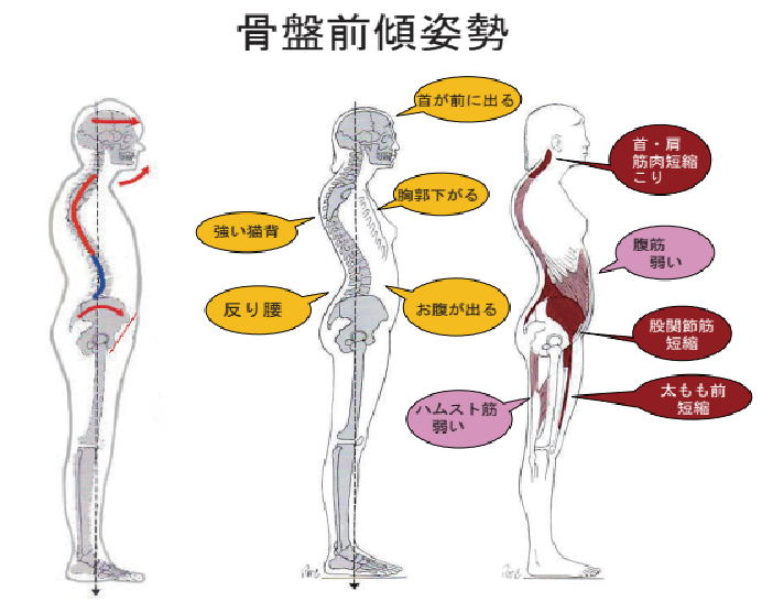 | ●原因 ・悪い姿勢の維持 ・妊婦または出産後の姿勢の固着化 ・腹筋の筋力低下 ・肥満 など |