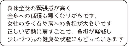 | ●よく出る症状 ・肩こり・首痛 ・反り腰・腰のつまり感など ・関節炎 ・股関節痛 ・膝の前側の痛み ・顎関節症 ・頭痛 ・ヘルニア、すべり症など ・手のしびれなどの胸郭出口症候群 |